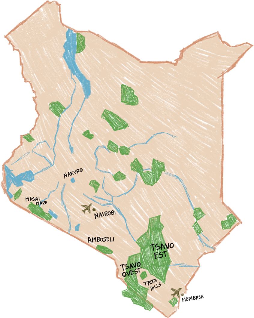 Tsavo est, Amboseli, Tsavo ovest, Taita Hills, Masai Mara, Nakuru